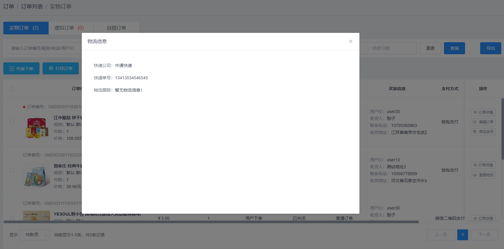 在订单列表展示界面,选择需要查看物流的订单,点击右侧操作栏【查看物流】按钮,可进行订单物流查看(需要对接快递100),如图所示: