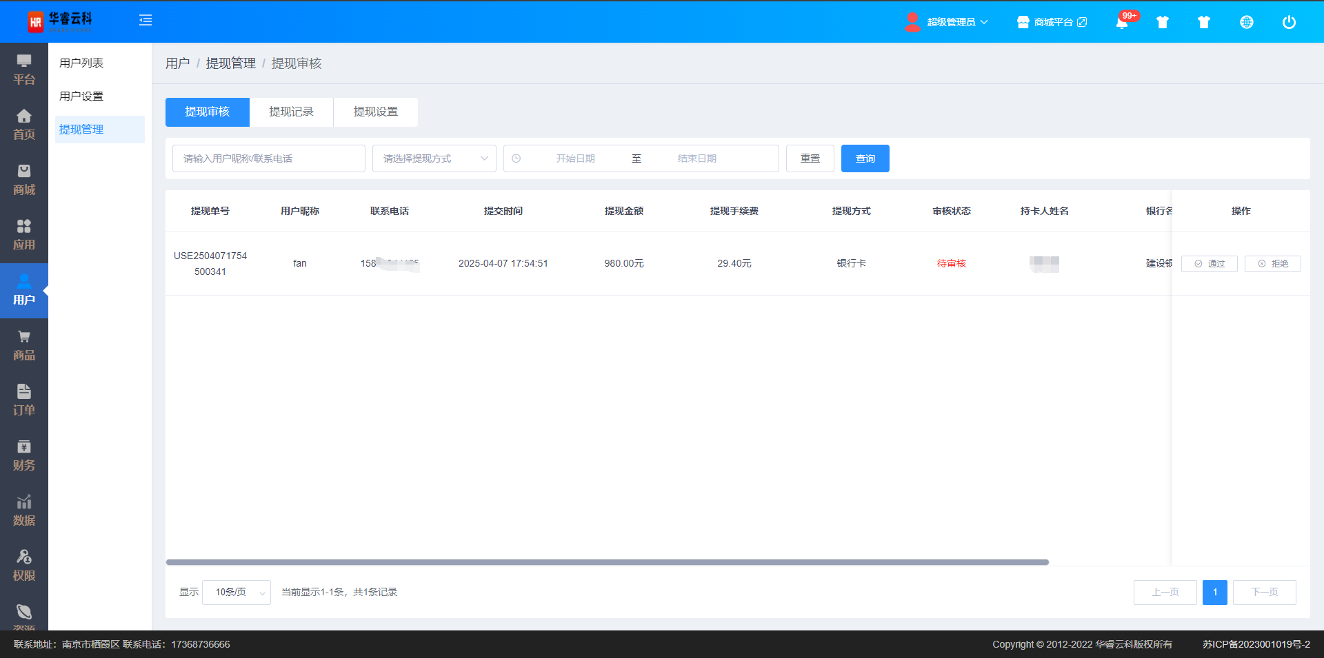 通过:同意用户提现,提现金额扣除手续费后,线下到账用户银行卡内,同时移动端可查看流水明细。