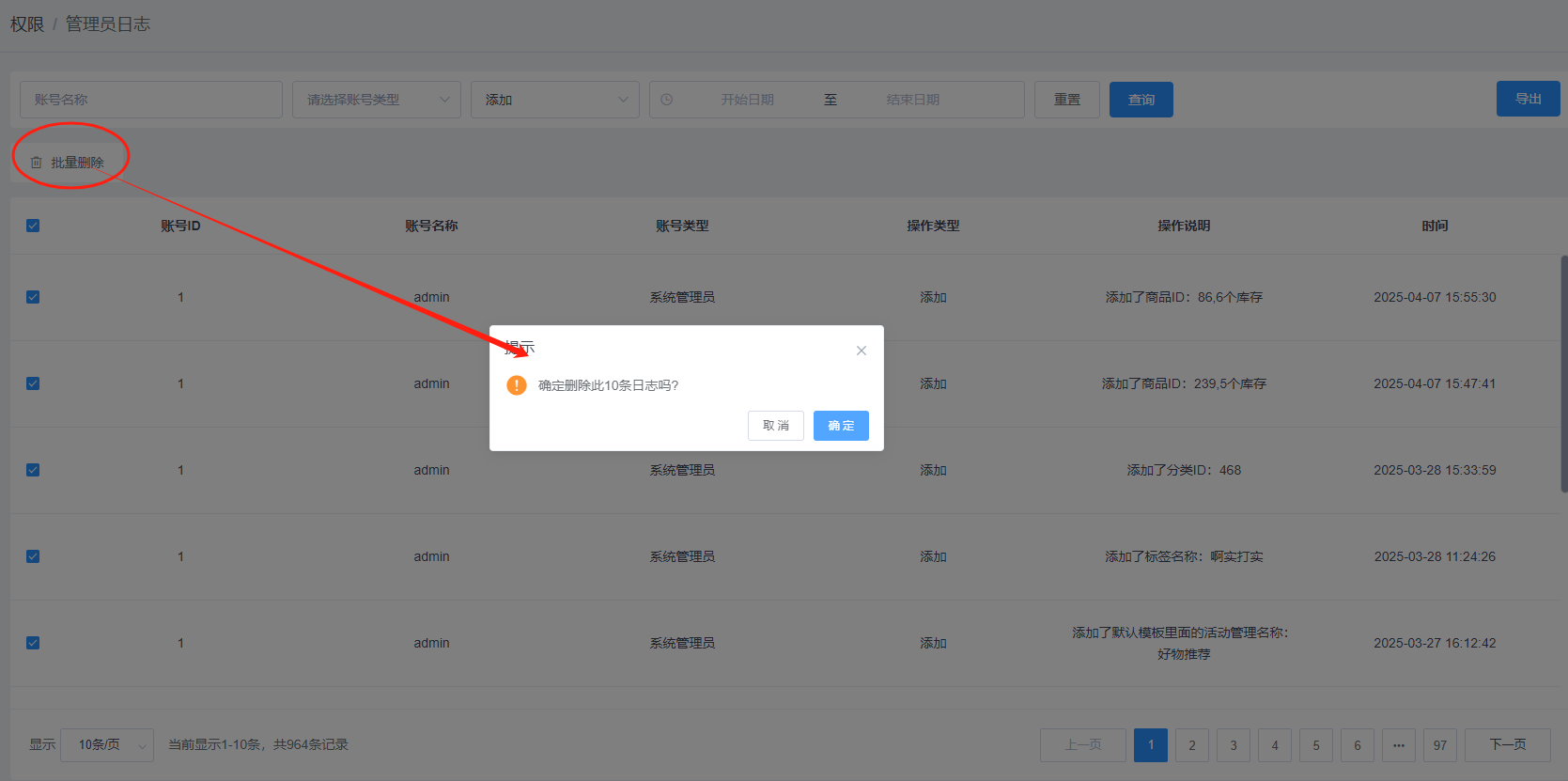 在管理员日志管理页面,选择一条或多条管理员日志记录,点击【批量删除】按钮,可删除管理员记录,如图所示:
