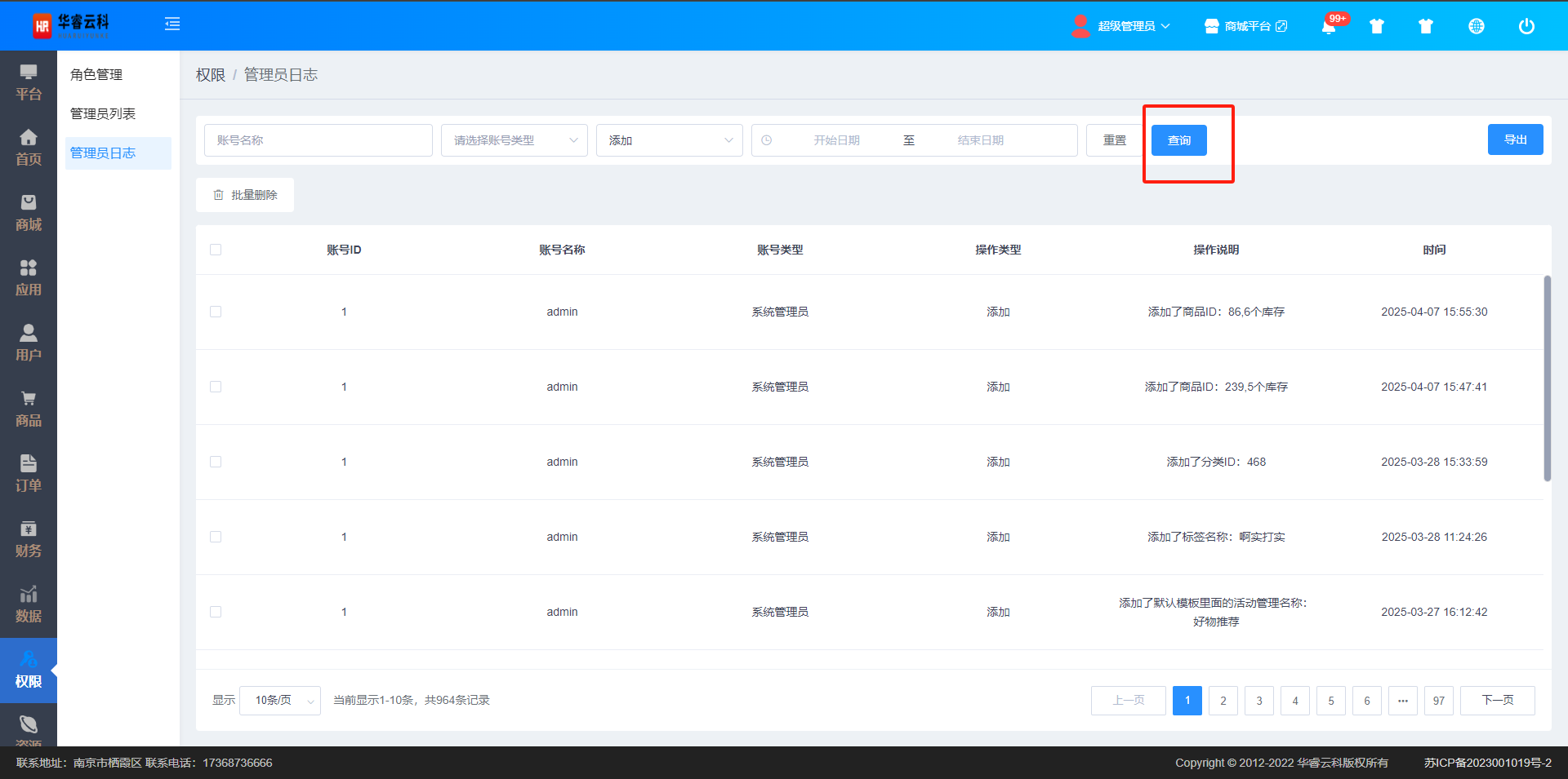 点击权限管理->管理员日志,进入管理员日志管理页面,通过管理员账号、操作时间段,点击【查询】按钮,可查询到满足条件的日志记录,如图所示:
