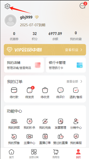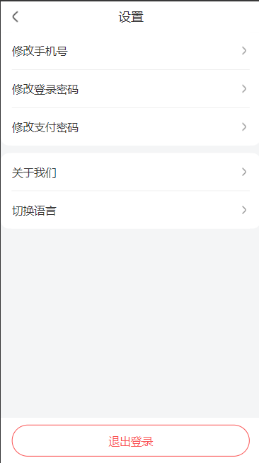 进入“个人中心”,点击设置图标,界面跳转至支付密码、登录密码、手机号码等修改界面,小程序无退出按钮、修改登录密码。