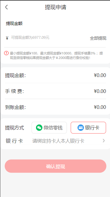 - 一天之内只可以成功提现(平台审核通过)一次(防止恶意提现)