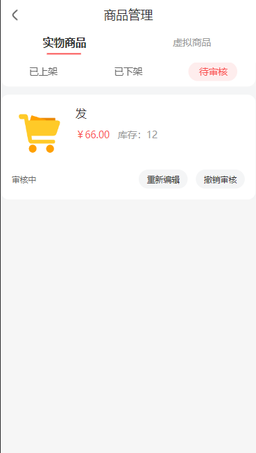 重新编辑:进入编辑页面,修改商品信息后,点击【提交审核】,可将重新编辑后的商品提交审核。