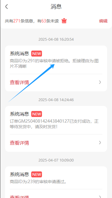 可在我的店铺->消息中,查看审核失败商品的具体拒绝原因,如图所示: