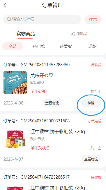 也可在我的订单中,找到该待发货的订单,验证码核销。