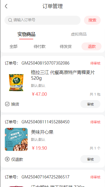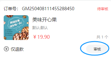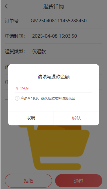选择仅退款的待审核记录,点击【审核】按钮,进入退款详情页面,可查看退款原因、金额、时间等,点击【通过】,输入退款金额,点击【确认】,即可退款成功。