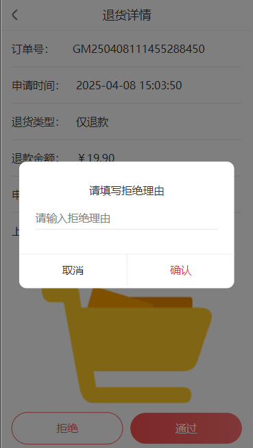 审核拒绝:点击【审核】,进入退货页面,点击【拒绝】,输入拒绝理由,点击【确认】按钮,拒绝用户退款申请。