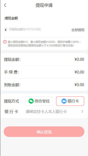 - 提现的手续费从提现的金额中扣除,实际到账金额=提现 金额-手续费;