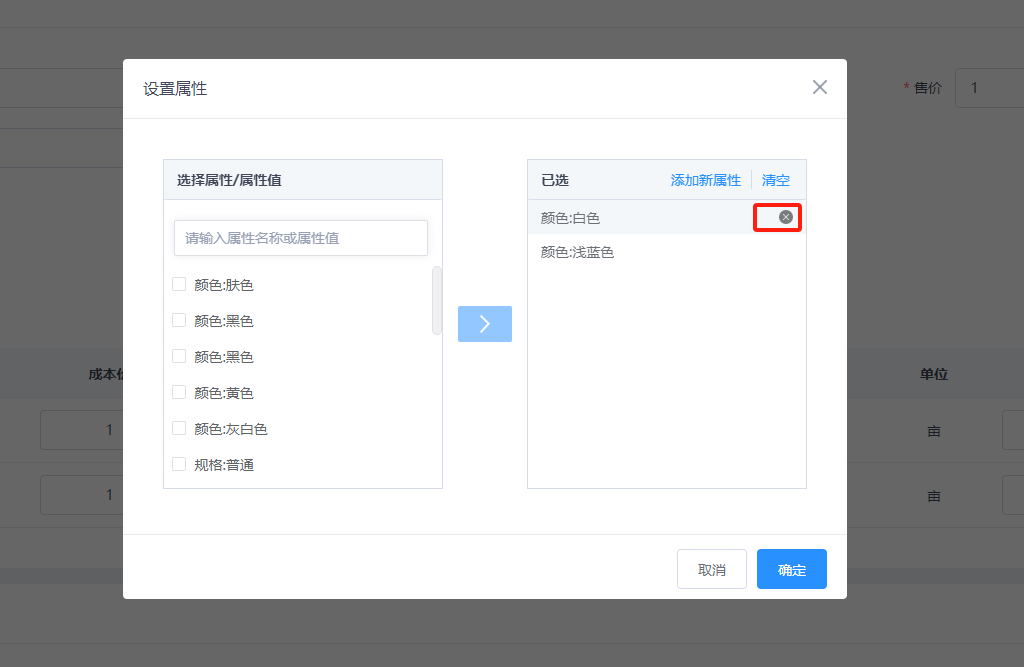 若是属性添加有误,则点击属性后面的“X”按钮,可删除已选的属性,如图: