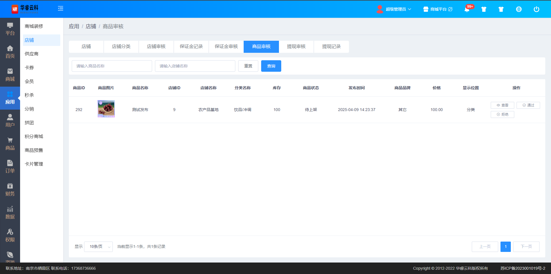 点击【保存】,直接将商品提交审核,状态为审核中,显示在商品管理->待审核商品页面和商城管理平台应用->店铺->商品审核页面,平台审核通过后,状态变为已上架,显示在商品管理->商品列表页面。