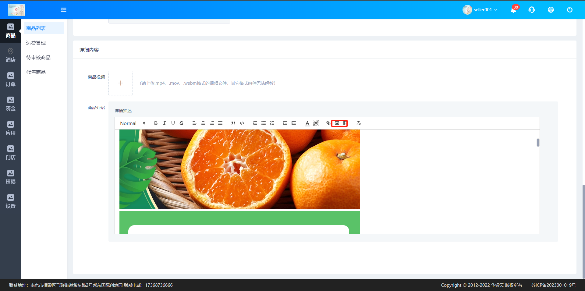 商品详情:选填,可编辑商品描述信息,也可上传商品图片,如图:
