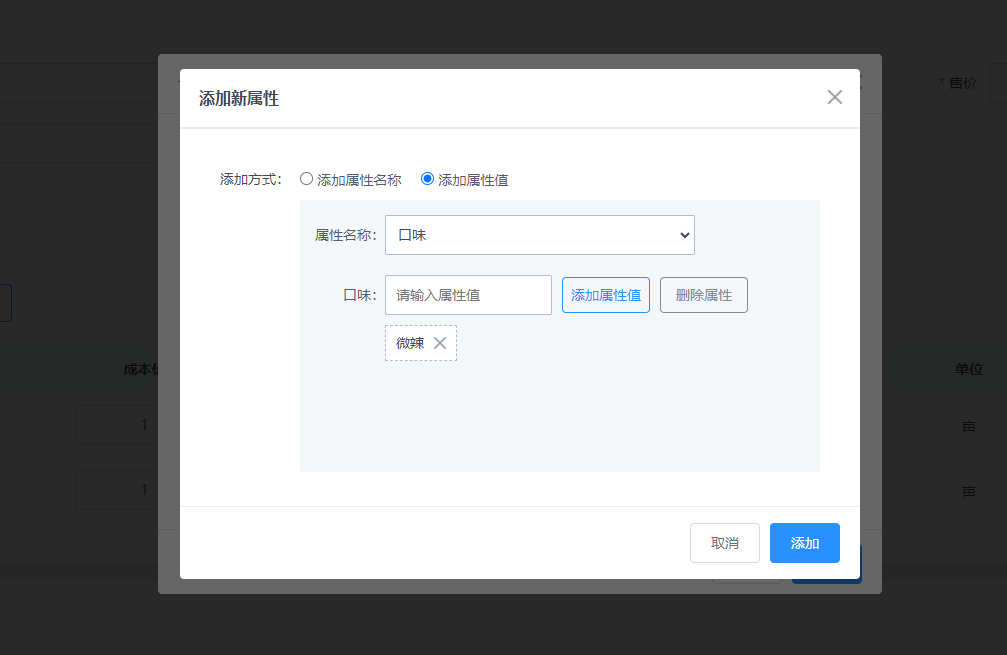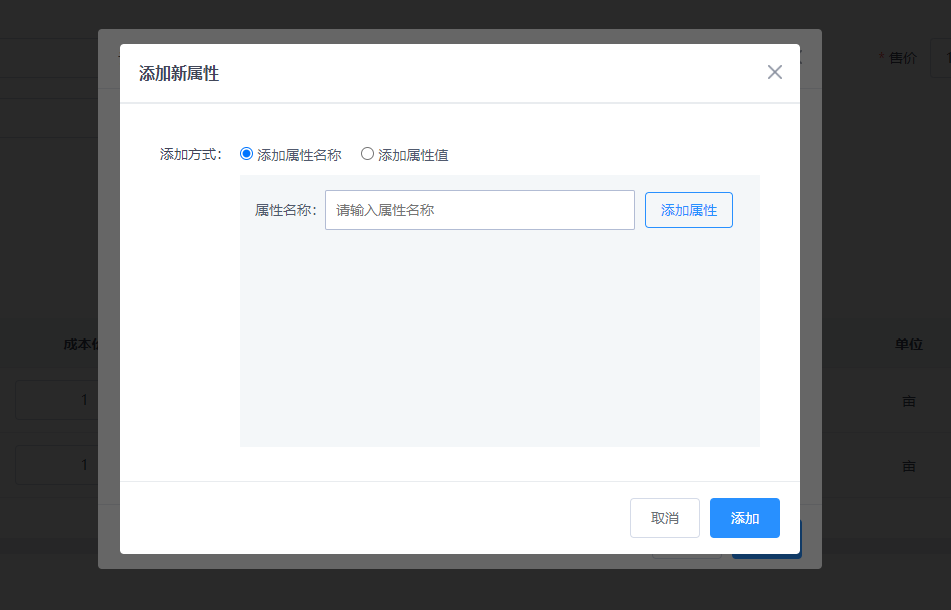 若需设置新属性,则点击已选框的【添加新属性】按钮,弹出添加新属性的弹窗,如图: