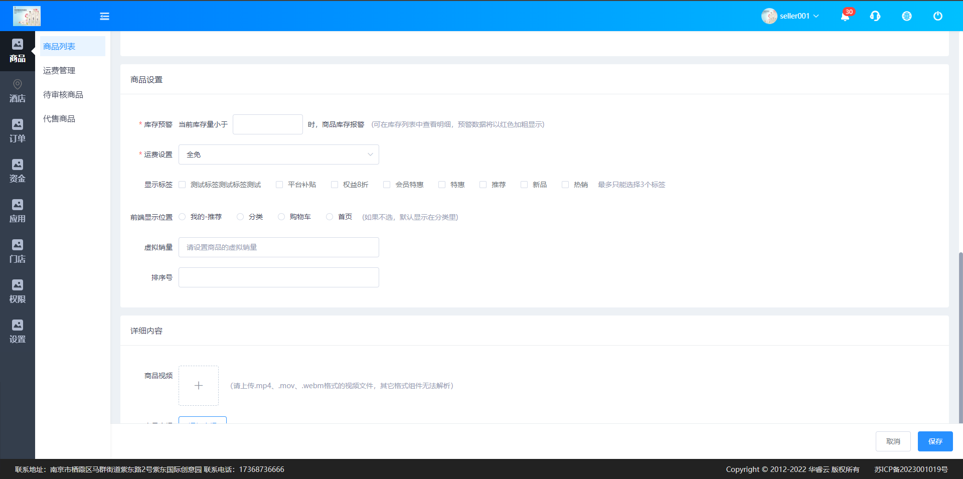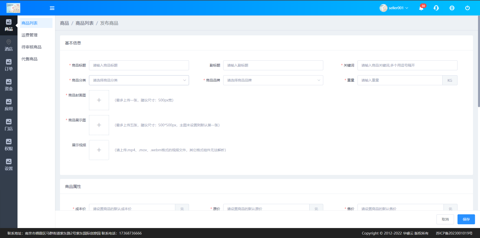 在商品列表页面,点击【发布商品】按钮,进入商品发布页面,输入商品基本信息、商品属性、商品设置和商品详情,如图: