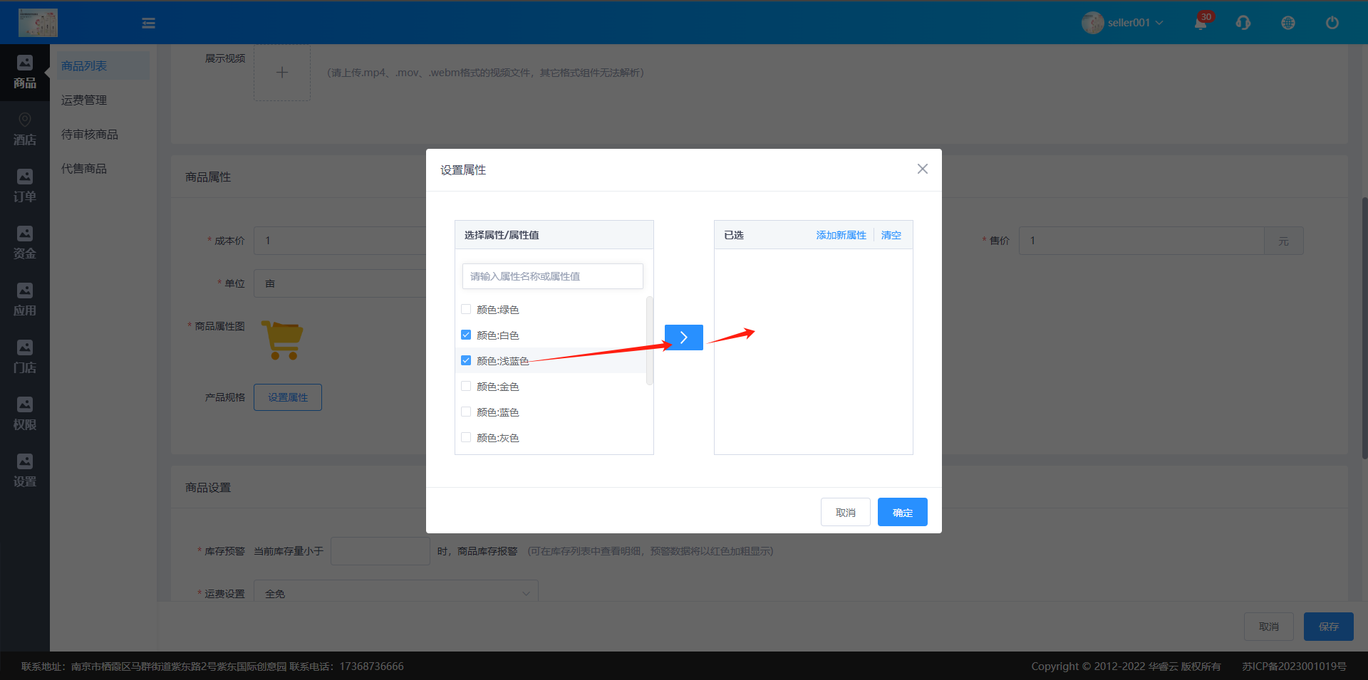 通过属性名称查询,选择属性值后,点击中间的蓝色框按钮,即可将选中的属性值添加到已选框中,如上图所示