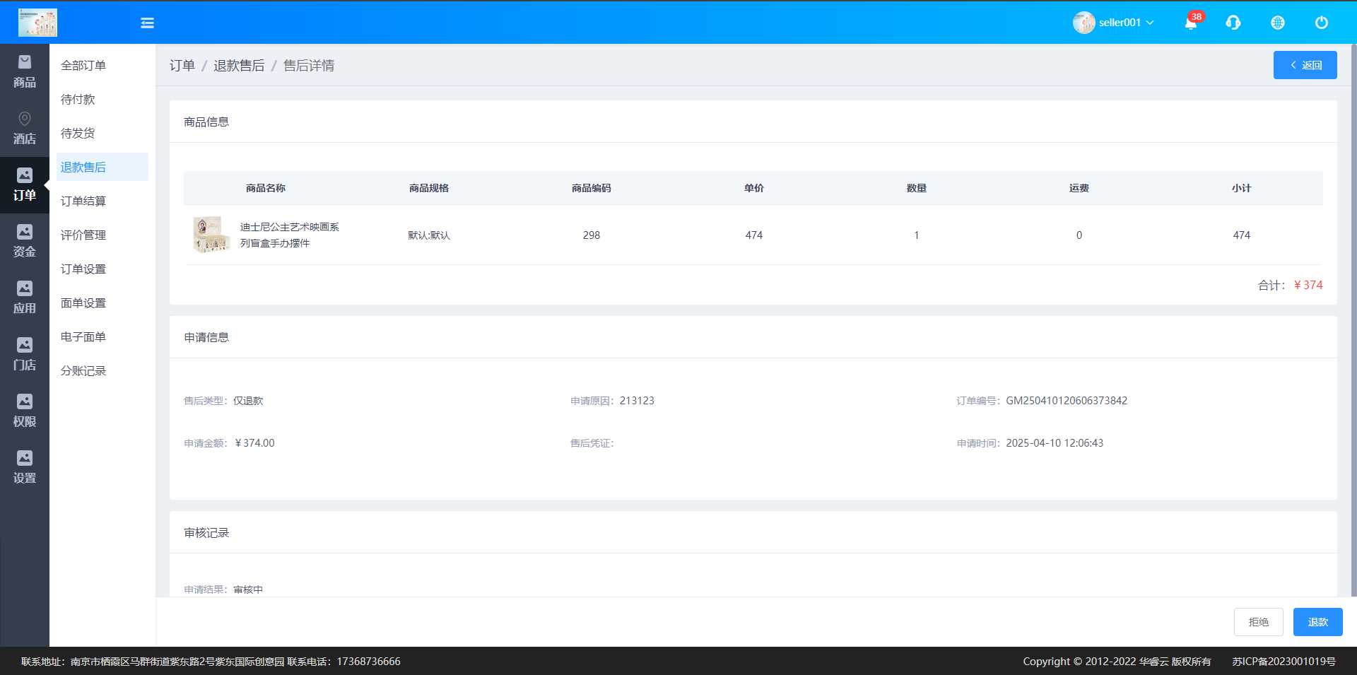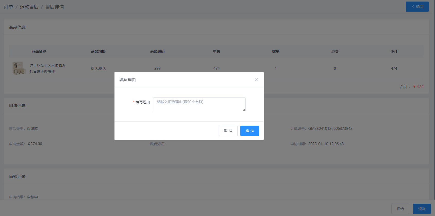 审核拒绝:点击【审核】,进入审核信息页面,点击【拒绝】,输入拒绝理由,点击【确定】按钮,拒绝用户退款申请,如图: