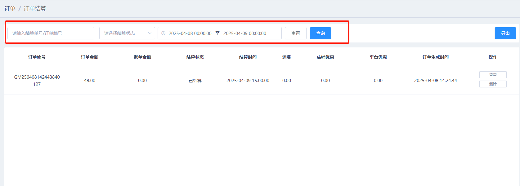 在结算列表,输入结算单号、订单编号、订单生成时间段或者结算状态,点击【查询】,可查询出具体的记录,如图: