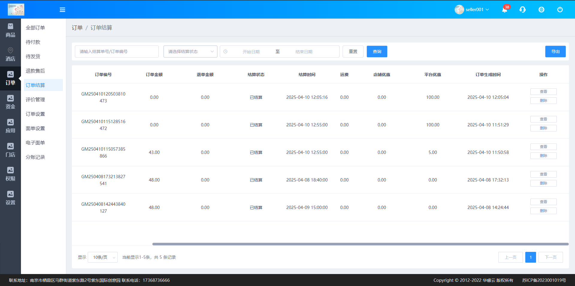 订单结算主要呈现该店铺所有订单的订单结算记录,包含订单中的订单金额、退单金额、优惠金额、结算状态,如图: