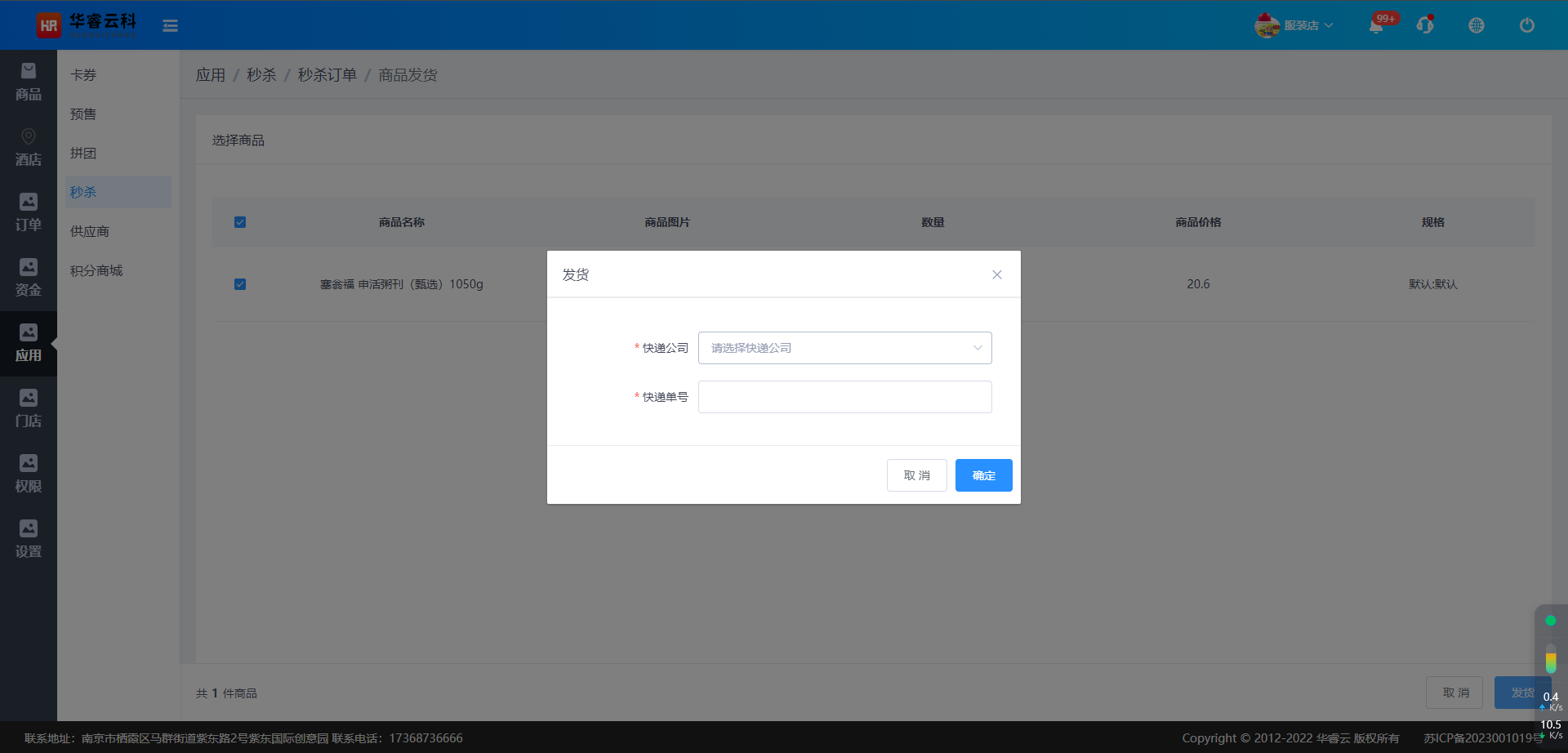 在秒杀订单列表展示界面,选择需要发货的‘待发货’订单,点击右侧操作栏【商品发货】按钮,可进行商品发货