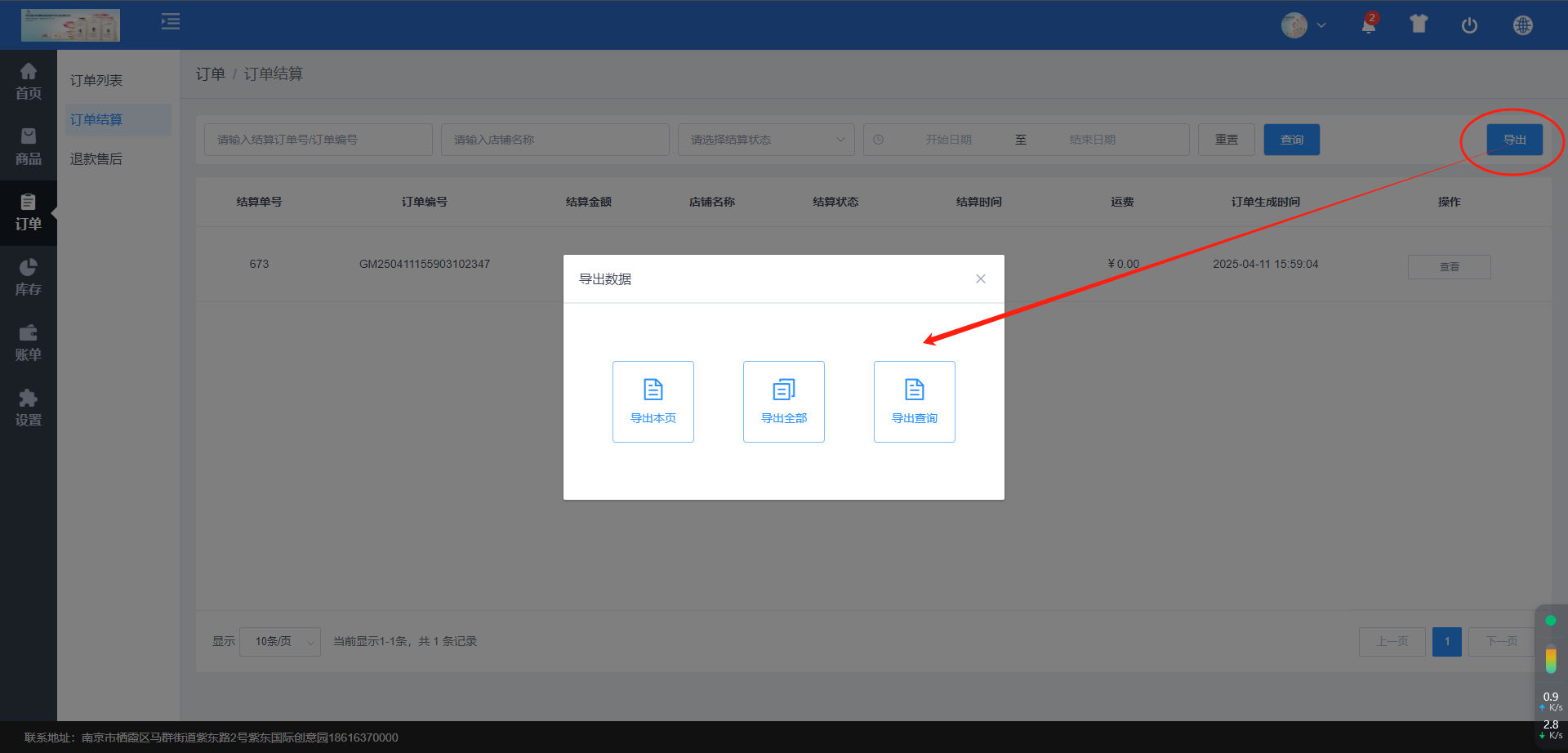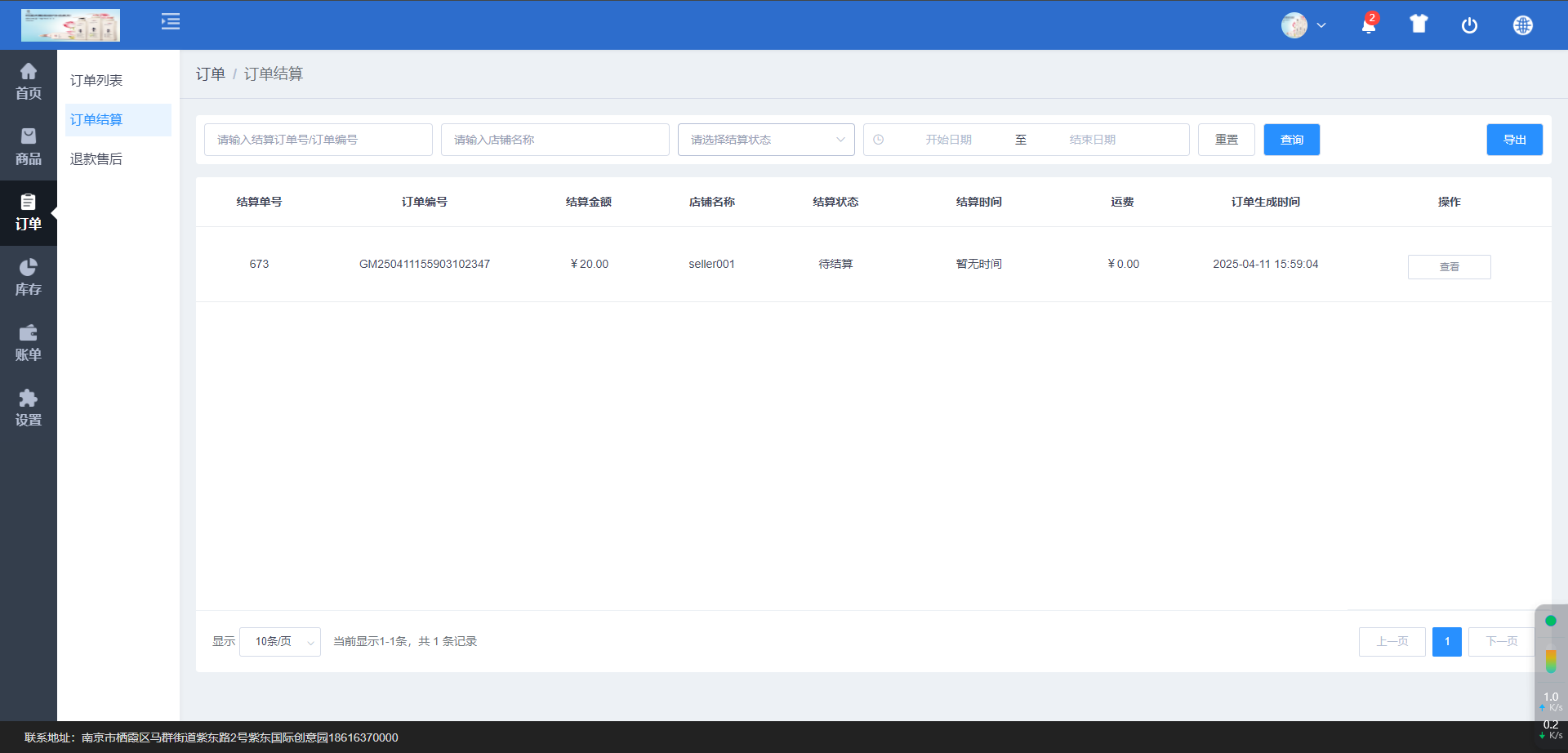订单结算中可以看到结算单号、订单编号、结算金额、店铺名称、结算状态、结算时间、运费、订单生成时间、查看详情,点击查看详情,可查看到订单的基本信息、收货人信息、商品信息
