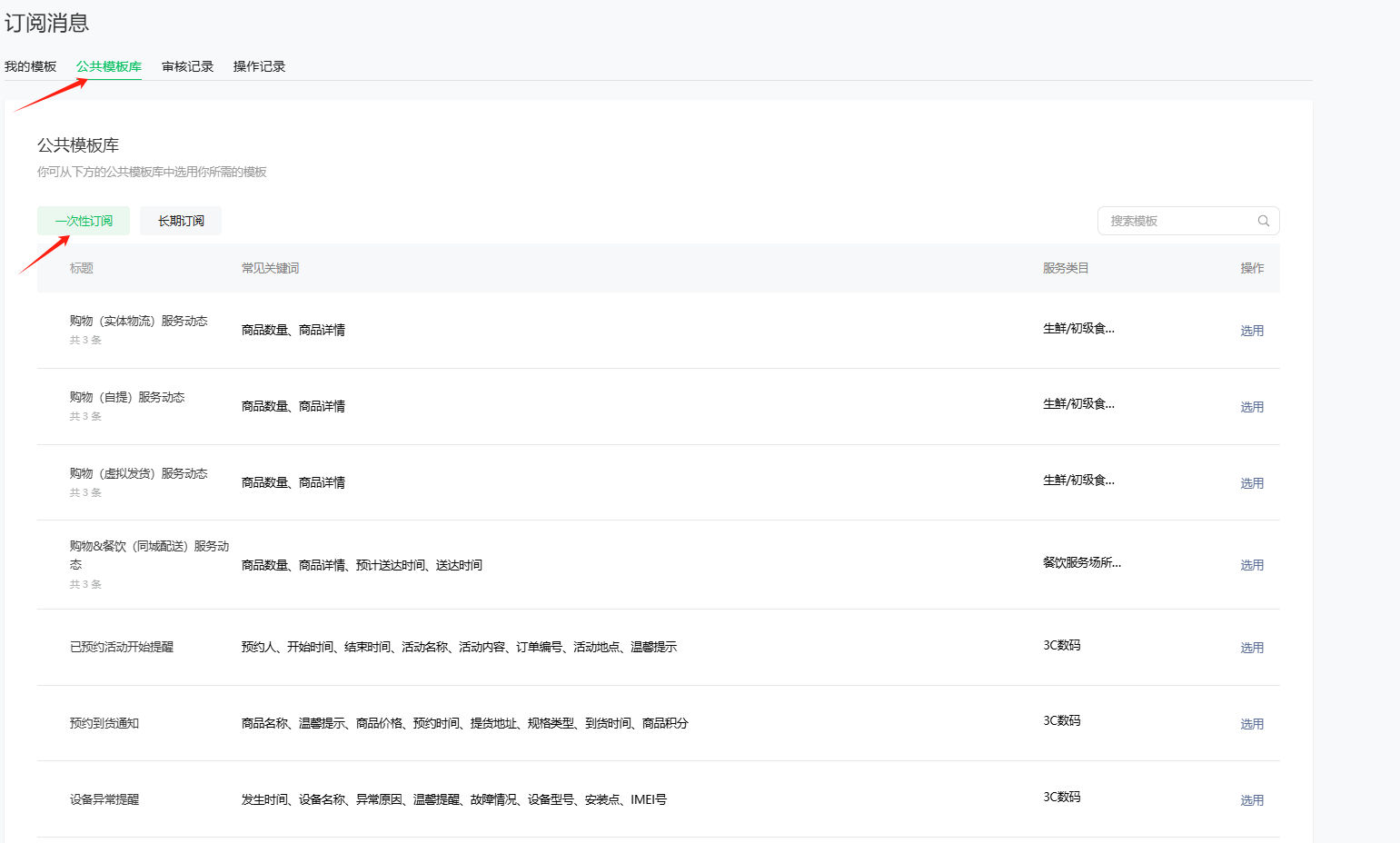 2、在订阅消息模块中,选择“公共模板库”“一次性订阅” ,选择订单支付成功通知,订单发货通知、退款通知模板进行添加
