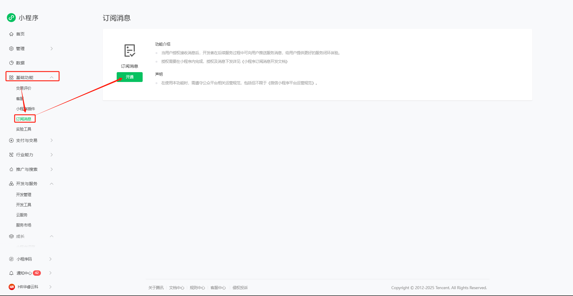 1,登录之后,点击左侧导航栏 – 功能 – 订阅消息,先开通,再申请消息模板