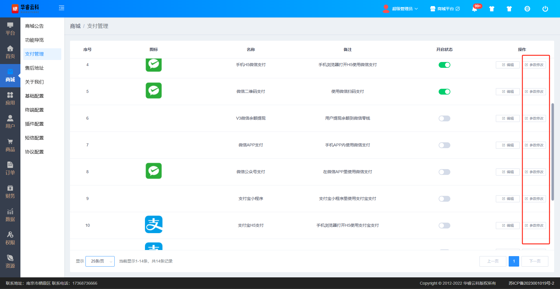 目录 搜索 展开 商城前期准备资料第一章 平台后台管理中心首页平台系统设置权限管理商城列表图片设置商品SKU公告管理数值管理报表管理物流管理商城商城公告功能导览支付管理售后地址关于我们基础配置终端配置插件配置卡券插件店铺插件预售插件积分商城插件秒杀插件分销插件会员插件拼团插件短信配置协议配置应用商城装修DIY模版店铺店铺列表店铺审核商品审核提现审核提现记录供应商供应商管理商品库待审核商品供应商订单经营收益提现审核提现记录提现设置卡券会员会员列表秒杀秒杀标签秒杀记录秒杀订单分销分销等级分销商管理分销商品佣金记录提现记录推荐关系商品预售商品列表预定记录销售记录预售订单积分商城积分商品兑换订单拼团拼团活动开团记录参团记录拼团订单资源商品商品分类分类审核商品品牌品牌审核运费管理商品列表商品排序显示下架商品商品删除商品导出商品标签库存管理库存预警入货详情出货详情订单订单列表实物订单代客下单打印订单自提订单退款售后订单设置评价管理订单结算用户用户列表添加用户余额充值积分充值代客下单用户设置提现管理提现审核提现记录提现设置 财务数据用户报表订单报表商品报表权限角色管理管理员列表管理员日志基本信息设置修改管理员密码第二章 商家后台管理中心商家登录验证码登录找回密码退出登录设置店铺信息轮播图设置修改密码店铺打烊店铺注销门店门店列表添加门店编辑门店信息删除门店门店查询权限角色管理添加角色查看角色编辑角色删除角色菜单列表添加菜单管理员列表添加管理员删除管理员管理员日志查询日志删除日志导出日志商品商品列表发布商品商品查询编辑商品信息商品上架商品下架增加库存商品删除商品导出查看商品待审核商品商品查询提交审核审核失败撤销审核编辑商品删除商品代售商品添加代售商品代售商品查询代售商品编辑代售商品删除订单全部订单订单查询订单编辑订单详情订单发货查看物流删除订单订单导出退款售后仅退款审核退货退款审核换货审核查看退货详情订单结算查看详情删除记录导出记录资金入账记录记录查询记录导出出账记录记录查询记录导出提现明细提现明细查询提现明细导出申请提现银行卡添加银行卡查询银行卡编辑银行卡信息设置默认银行卡 删除银行卡售后明细应用积分商城商品查询添加商品商品编辑商品删除商品排序兑换订单秒杀秒杀标签删除秒杀标签编辑秒杀标签秒杀商品查看秒杀详情秒杀记录秒杀订单订单删除编辑订单订单发货查看物流供应商供应商商品供应商订单退款售后订单结算第三章 移动端操作手册注册登录用户注册授权手机号码用户登录会员续费会员开通会员订单管理用户下单订单提醒订单删除订单查询自提订单再次购买订单取消订单详情查看物流确认收货商品评价申请售后撤销售后申请用户回寄商品个人中心用户个人资料设置银行卡管理用户积分用户消息用户钱包余额充值余额提现购物车申请开店我的店铺营销工具优惠券店铺设置运费模板门店管理发布商品发布实物商品发布虚拟商品设置属性商品管理待审核商品商品列表经营数据粉丝订单管理订单查询订单编辑订单关闭订单发货查看物流订单详情自提订单虚拟订单退款退货退款换货退货详情银行卡管理资金管理余额提现交易明细订单结算收银买单店铺打烊店铺注销秒杀限时秒杀立即抢购我的秒杀分销分销关系绑定申请成为分销商分销中心分销商推广我的团队佣金明细佣金提现提现明细推广订单分销规则商品分享分销商品分享插件商品分享店铺主页分享分销中心分享支付功能中心商品收藏取消商品收藏店铺关注取消店铺关注我的客服找回密码优惠券领取优惠券我的优惠券使用优惠券商品预售预售商品购买我的预售积分商城积分商品兑换我的兑换商品首页商品全部分类商品搜索商品详情第四章 供应商后台管理中心供应商后台登录系统退出修改供应商密码首页设置设置基础信息打印配置商品商品列表待审核商品违规下架商品发布商品运费管理关联店铺商品分类商品品牌订单订单列表订单结算退款售后库存库存列表库存预警入库详情出库详情账单提现记录银行卡管理出入账记录配置手册 小程序订阅消息配置阿里云短信服务配置阿里云OSS配置快递100配置支付配置手册后台支付配置支付方式说明配置参数详解支付宝手机支付所需参数操作步骤设置授权回调地址获取开发者私钥和支付宝公钥获取加密密钥获取APPID后台配置支付宝手机支付参数支付宝小程序支付所需参数 操作步骤获取APPID设置授权回调路径获取开发者私钥和支付宝公钥基础参数配置微信APP支付所需参数操作步骤获取AppId与AppSecret获取商户平台信息后台配置微信APP支付微信小程序支付所需参数操作步骤获取AppId与AppSecret设置授权回调路径获取商户平台信息 微信公众号支付所需参数操作步骤获取AppId与AppSecret设置授权回调路径获取商户平台信息公众号参数配置PC支付宝扫码支付所需参数常见问题商品分销供应商第五章 PC端操作手册首页展示我的购物车注册登录退出登录忘记密码我要开店商品列表商品详情立即购买退货/退款交易管理我的订单搜索售后管理搜索我的资产优惠券我的钱包钱包明细充值提现我