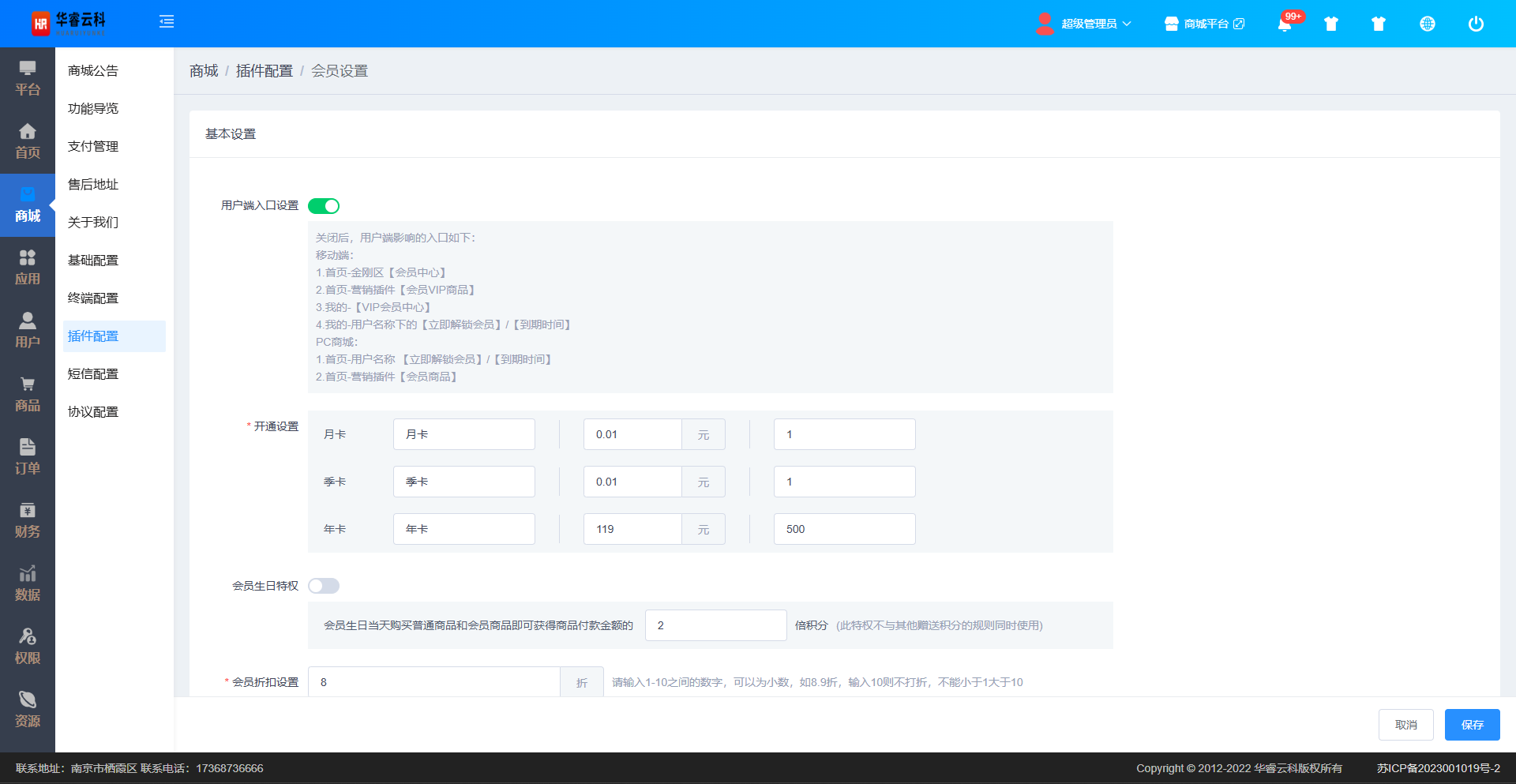 用户端入口设置:控制是否开启会员权益和会员中心功能。