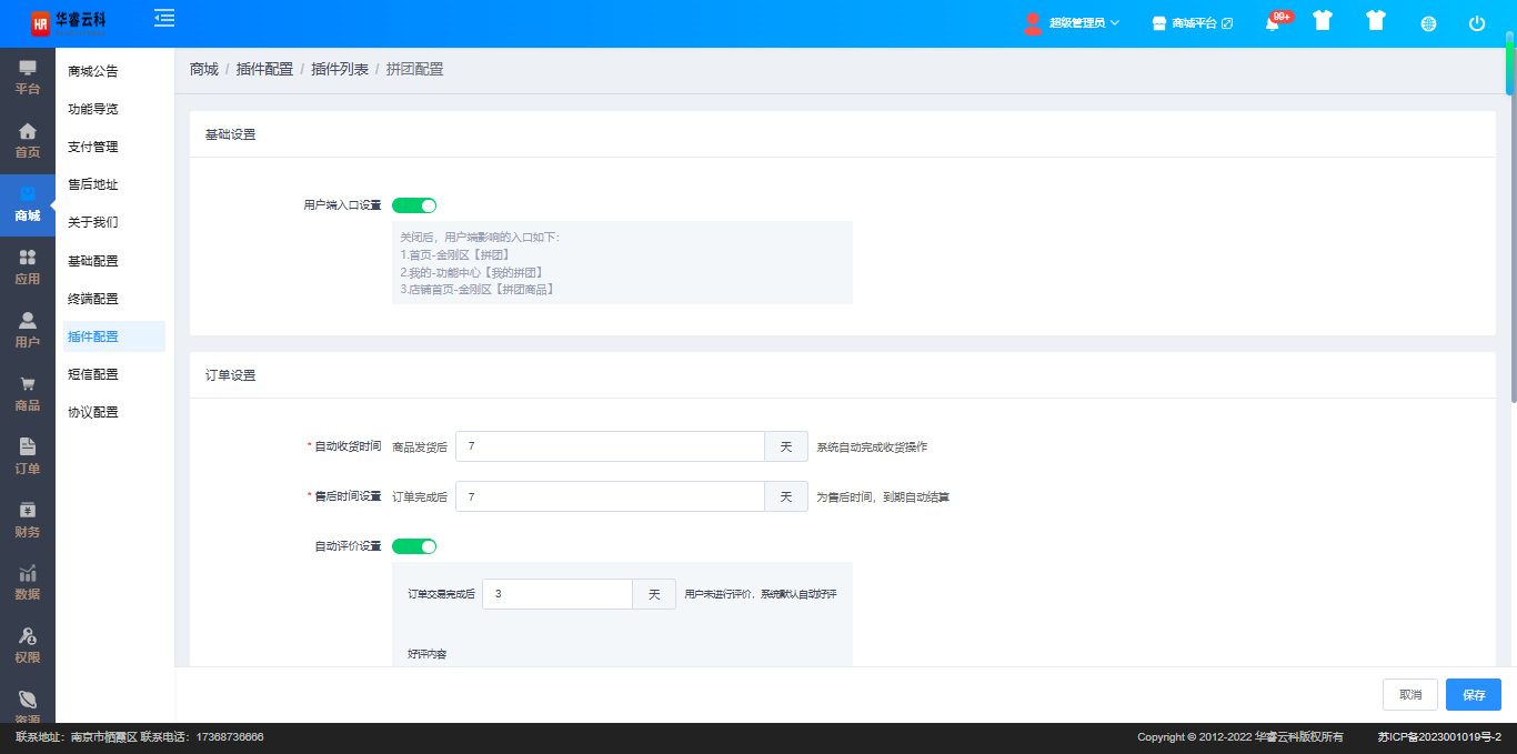 进入商城系统,点击“插件配置”->“拼团”,设置基本参数,点击“保存”开启拼团插件。