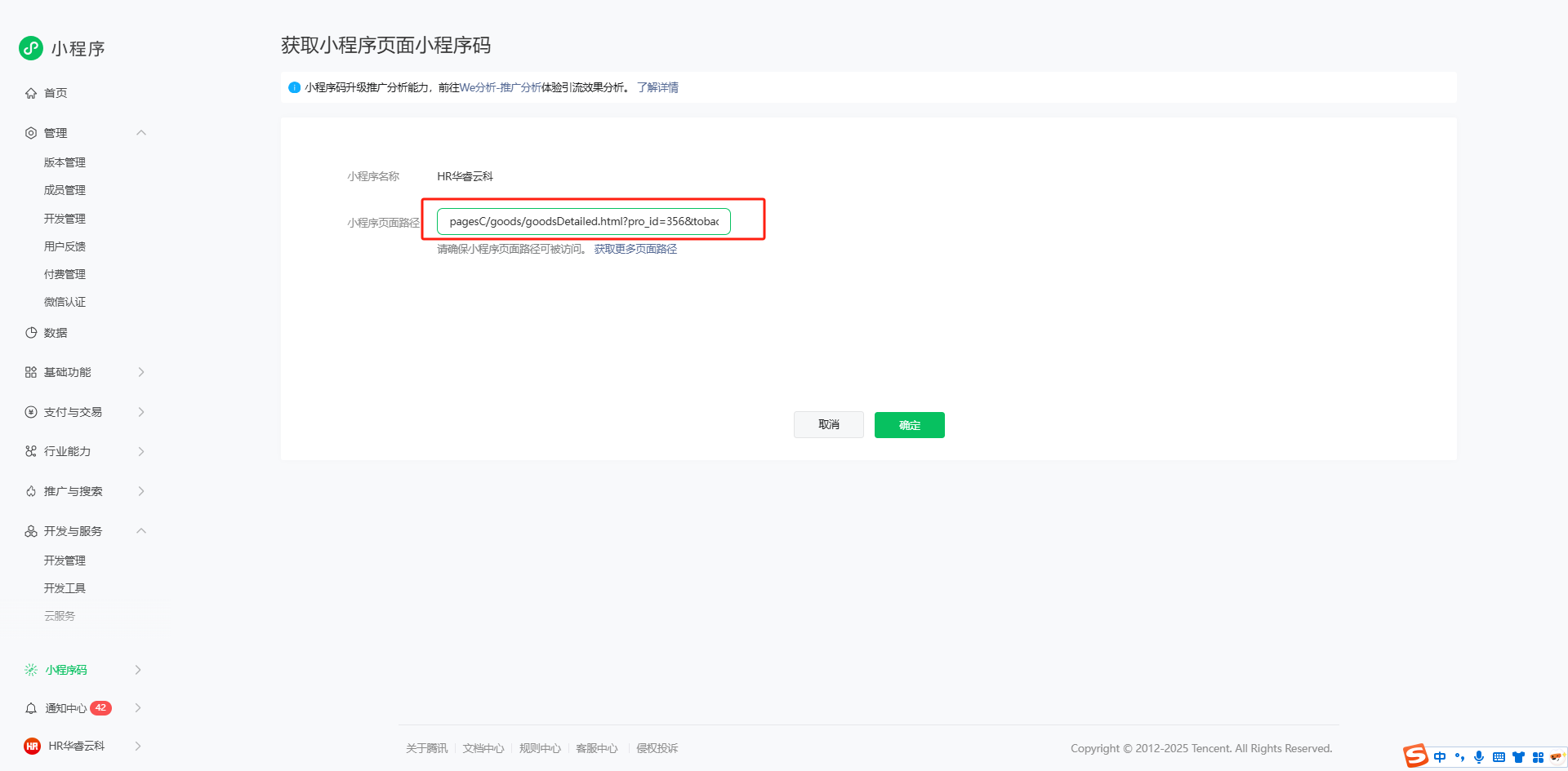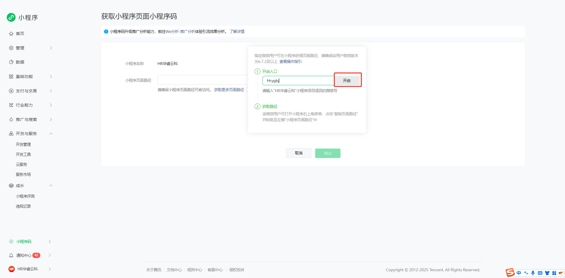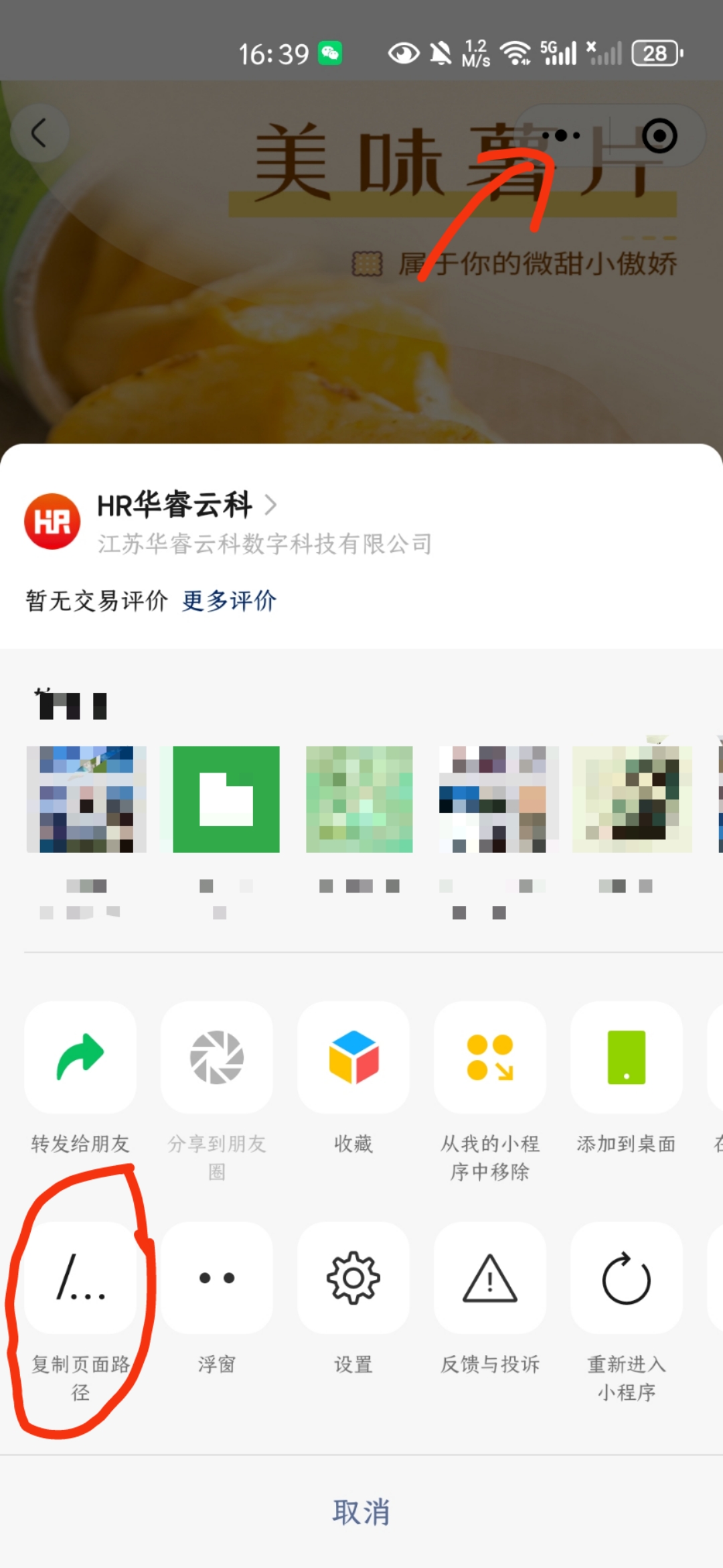 3、获取页面路径:指定的微信用户打开小程序(第一步选择的小程序,如:HR华睿云科),点击页面右上角菜单并选择“复制页面路径”。